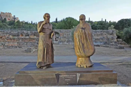 在雅典衛(wèi)城腳下的古市集遺址,矗立著著名雕塑家吳為山創(chuàng)作的青銅組雕《神遇——孔子與蘇格拉底的對話》。該片高度呼應(yīng)雕塑的主題創(chuàng)作精神,吳為山先生為本片題名,授權(quán)在片中使用雕像,并出鏡分享對跨文化交流的理解。